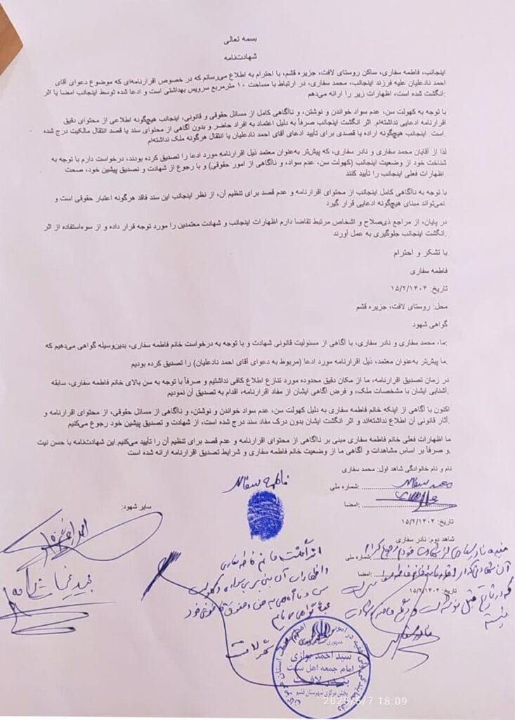 ایشان اضافه کرده اند که دیگر حاضر به شهادت نیستند. دلیل آن را می دانم. پبش از این آقای محمد سفاری (امین) رفتار و گفتار ناخوشایندی با شیخ نادر داشتند. شاید روزی قاضی ضروری بداند شیخ نادر در ذاذگاه حاضر شود و حقیقت را بگوید. اگر ایشان بگوید از محل مورد تنازع اطلاعی نداشته است، این پرسش مطرح می شود که چرا چنین متنی را تهیه کرده است و اقرار را گواهی کرده است.