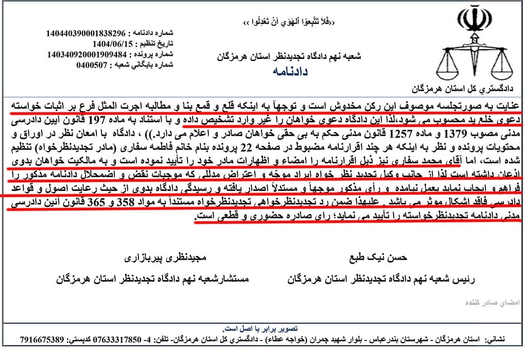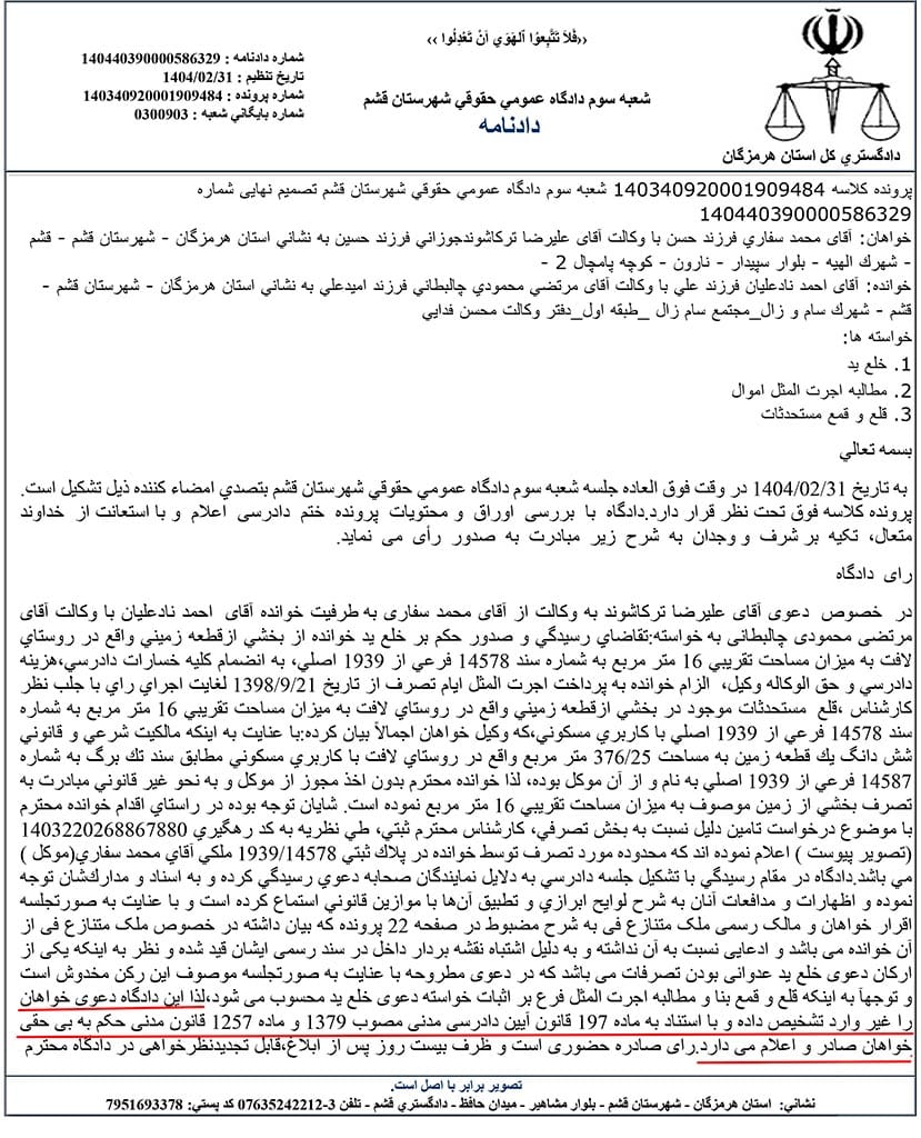 آقای محمد سفاری در دو مورد شکایت کرده بودند. اولی تصرف عدوانی بود. و دومی درخواست خلع ید بود. مدارک بالا نشان می دهد که حتی در دادگاه تجدید نظر درخواست ایشان رد شد.