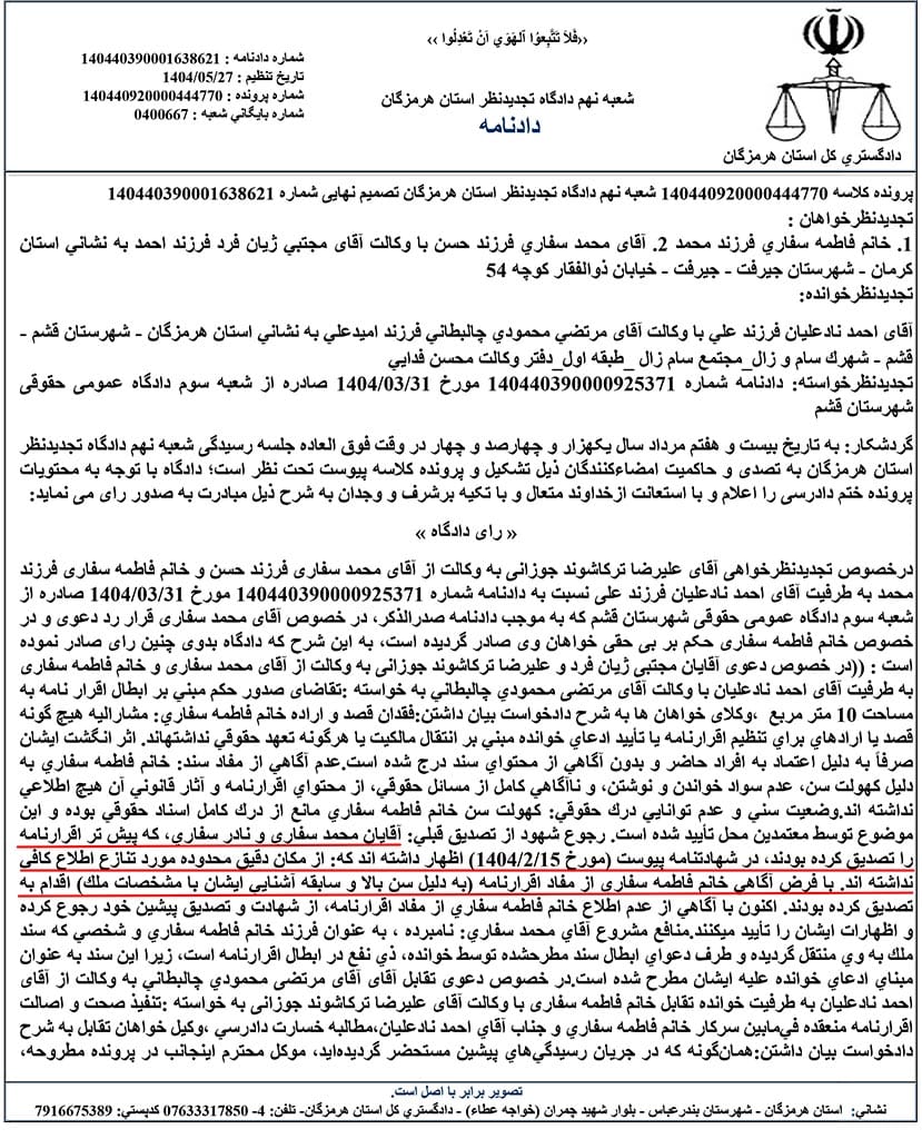پس از تشکیل دادگاه در پانزدهم ازدیبهشت 1404 و پرسش قاضی از مادر و خواهر آقای محمد سفاری و پرسش در خصوص اثر انگشت مادر آقای سفاری آنها دادخواست جدیدی تنظیم کرده اند و با وکالت آقایای مجتبی ژیان فرد و علیرضا ترکاشوند جوزانی درخواست ابطال سند داده اند. آنها دلایل متعددی را مطرح کرده اند. عدم آگاهی از مفاد سند، خانم فاطمه سفاری به دلیل کهولت سن، عدم سواد خواندن و نوشتن، و ناآگاهی کامل از مسائل حقوقی، از محتوای اقرارنامه و از مکان دقیق محدوده مورد تنازع هیچ اطلاعی نداشته اند.
