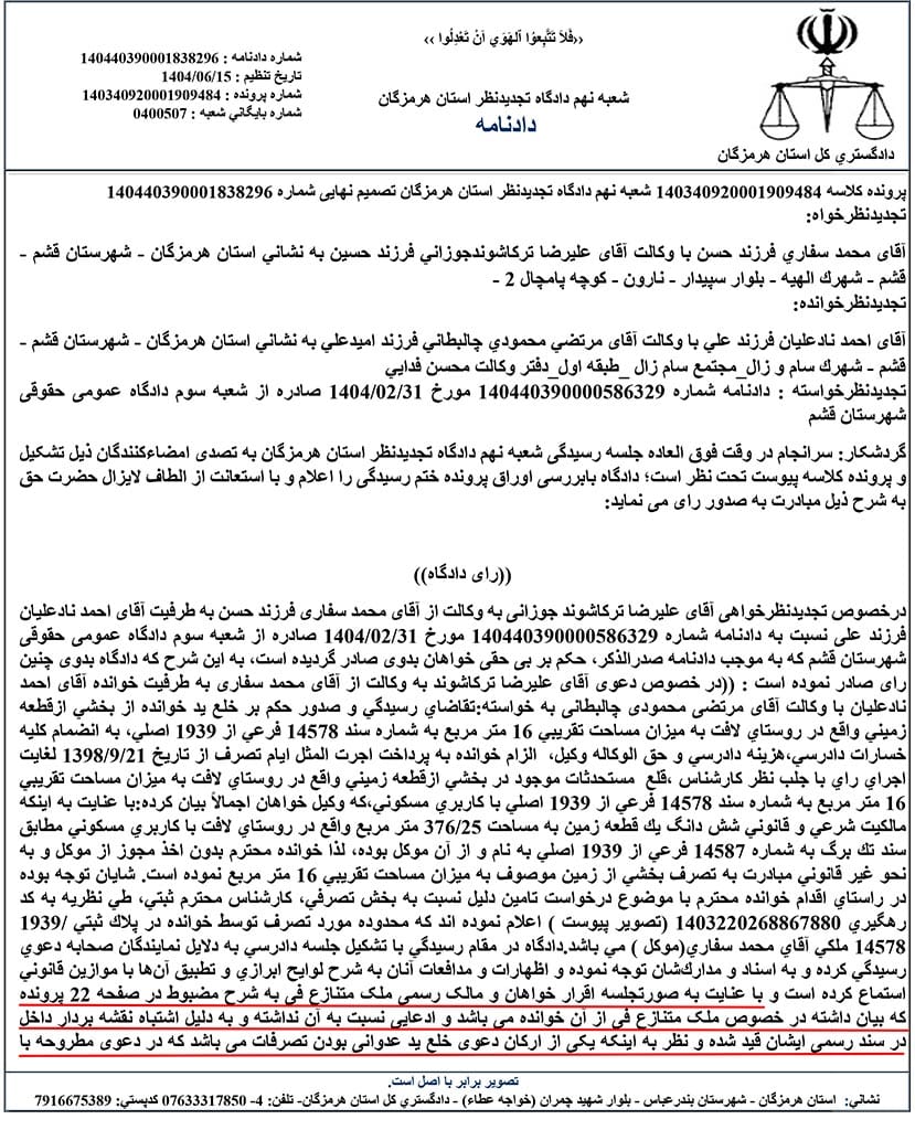 ذر روز 29 اردیبهشت این دادنامه صادر شده است. اسناد بالا نشان می دهند که من یک بار تبرئه شدم. اما آقای محمد سفاری (امین) نسبت به آن اعتراض داشتند و این دادنامه صادر شده است. مجددا تاکید می کنم این دروغ که واقعیت را معکوس جلوه دهند شرم آور است. اسنادی که افراد معتمد لافت هم آن را گواهی کرده اند نشان می دهد که ورثه مالک این سرویس بهداشتی همانطور که هست تحویل من داده اند. معنی مدتی است که مبادرت به تصرف کرده ام چه معنایی خواهد داشت.