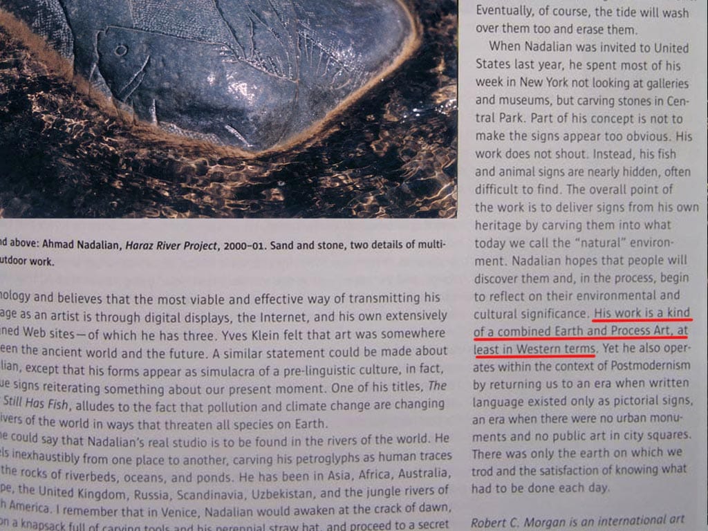 رابرت سی مورگان نادعلیان در مجله مجسمه امریکا کارهای احمد نادعلیان را معرفی کرد و در ارتباط با او کارهایش نوشت: کارهای نادعلیان ترکیبی از هنر زمین و فرایند هستند.
