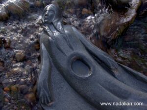 گاهی مجسمه هایش (الهه آب) را در محیط رودخانه ها چیدمان می کند. آب به همه ی مخلوقات و موجودات جهان جان می بخشد. در ایران باستان این باور وجود داشت که الهه ی آب «آناهیتا» همه ی آب های روی زمین و شیر مادران را تطهیر می کند. پی بردن این نکته اهمیت دارد که با توجه به پیشینه این آثار، مفهوم مورد نظرش آثارم در زمان حال، در بستری متفاوت ارائه می دهد که توجیهات و دستاوردهای گوناگونی را دارا می باشد.