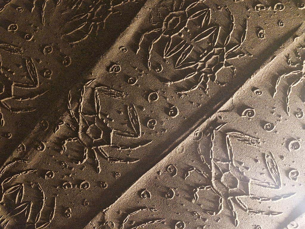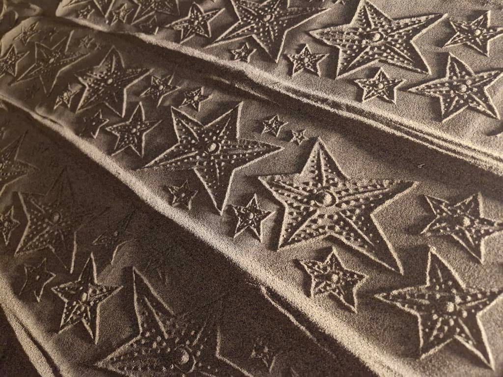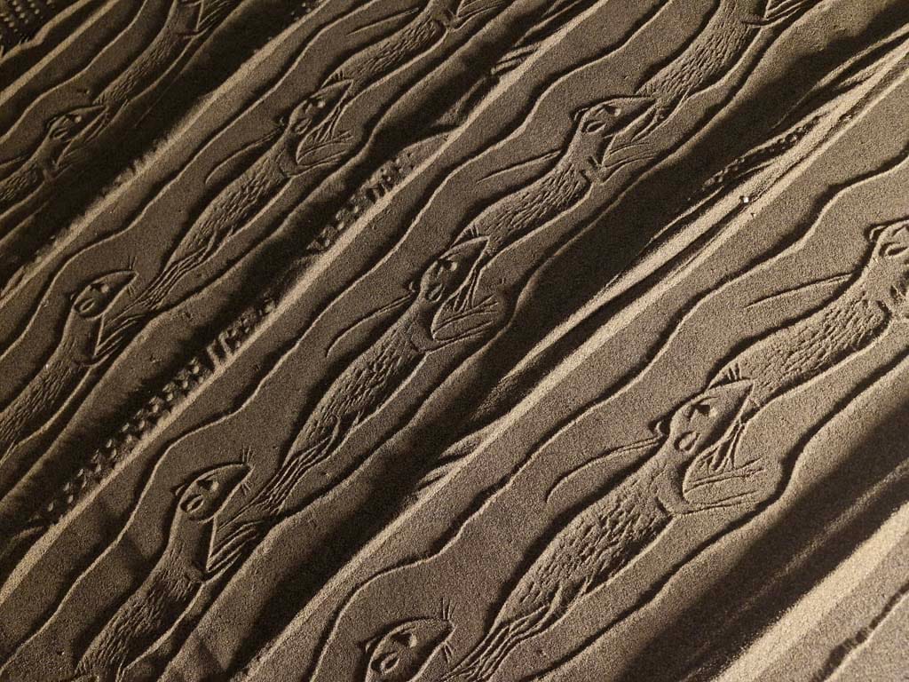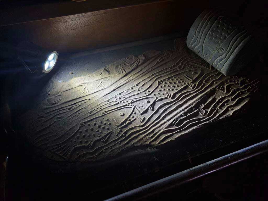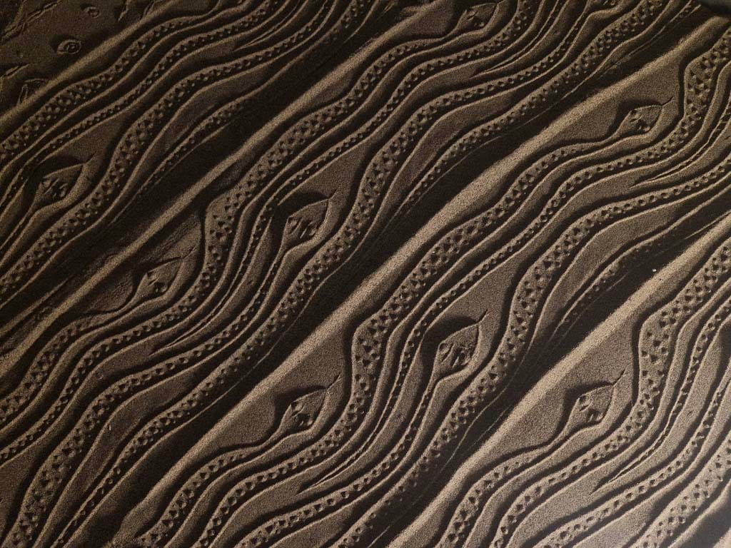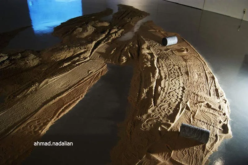 ساده ترین نوع چیدمان ریختن کمی ماسه بر روی یم میز کوچک است و یک نور مایل در شرایطی بوجود می آید تا بار حرکت دادن مهر بر روی ماسه ها نقش ها همانند نقوش در هنگام طلوع و یا غروب آفتاب در ساحل دریا یا کویر دیده می شوند.
