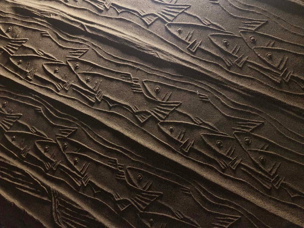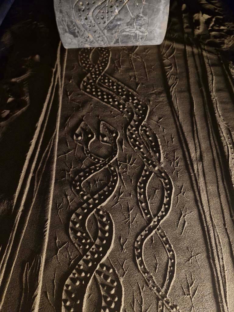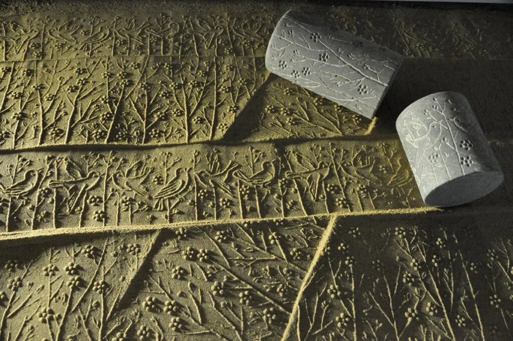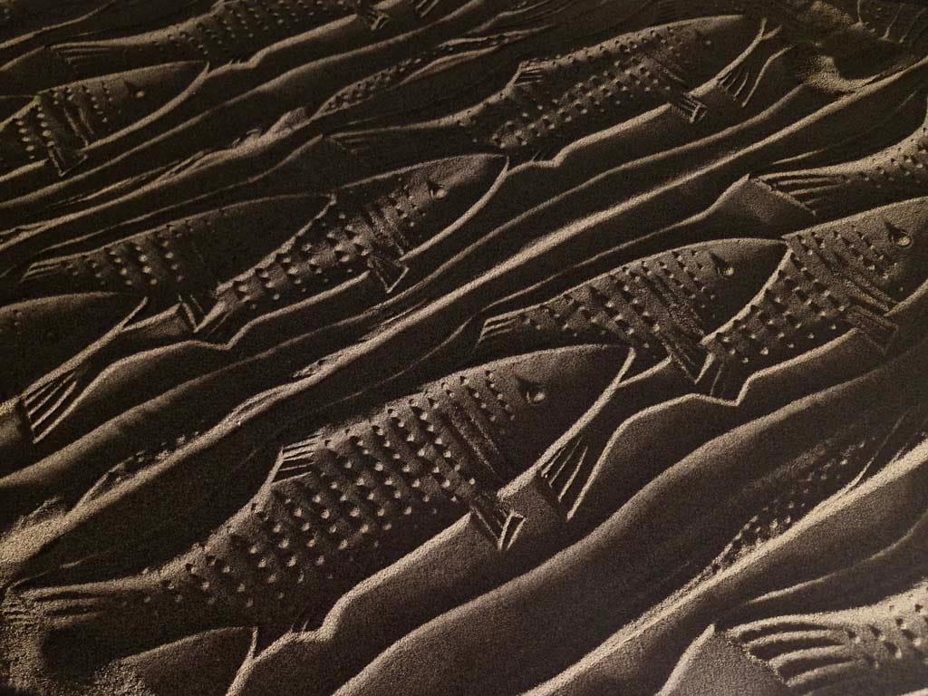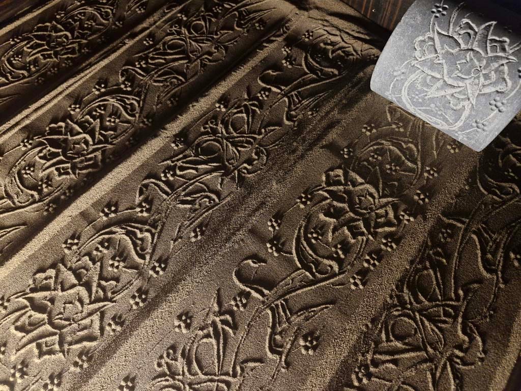 ساده ترین نوع چیدمان ریختن کمی ماسه بر روی یم میز کوچک است و یک نور مایل در شرایطی بوجود می آید تا بار حرکت دادن مهر بر روی ماسه ها نقش ها همانند نقوش در هنگام طلوع و یا غروب آفتاب در ساحل دریا یا کویر دیده می شوند.