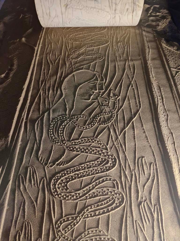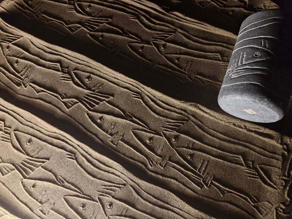 در موزه ها مهرها و نقش آنها بهصورت چیدمان (installation) ارائه میشوند: چیدمان زمینی: مهرها روی بستری از ماسه قابل چاپ هستند و مخاطب به آنها دسترسی دارد. مهرهای کوچک بر روی سکو قابل ازائه هشتند. مخاطب میتوانند آنها را حرکت دهد و نقش ایحاد کند. نمایش مستند تصویری: در کنار آثار، فیلم یا عکسهایی از چاپ مهرها در طبیعت (جزیره هرمز، سواحل و…) نمایش داده میشود. بعضی از مجموعه داران مهر را به همراه مستند تصویری همچون عکس چاپ شده که احمد نادعلیان آنها را تهیه کرده است خزیداری کرده اند.