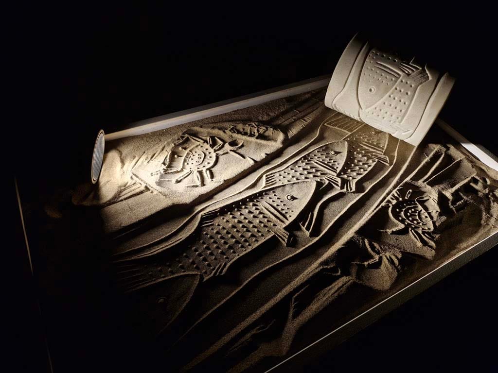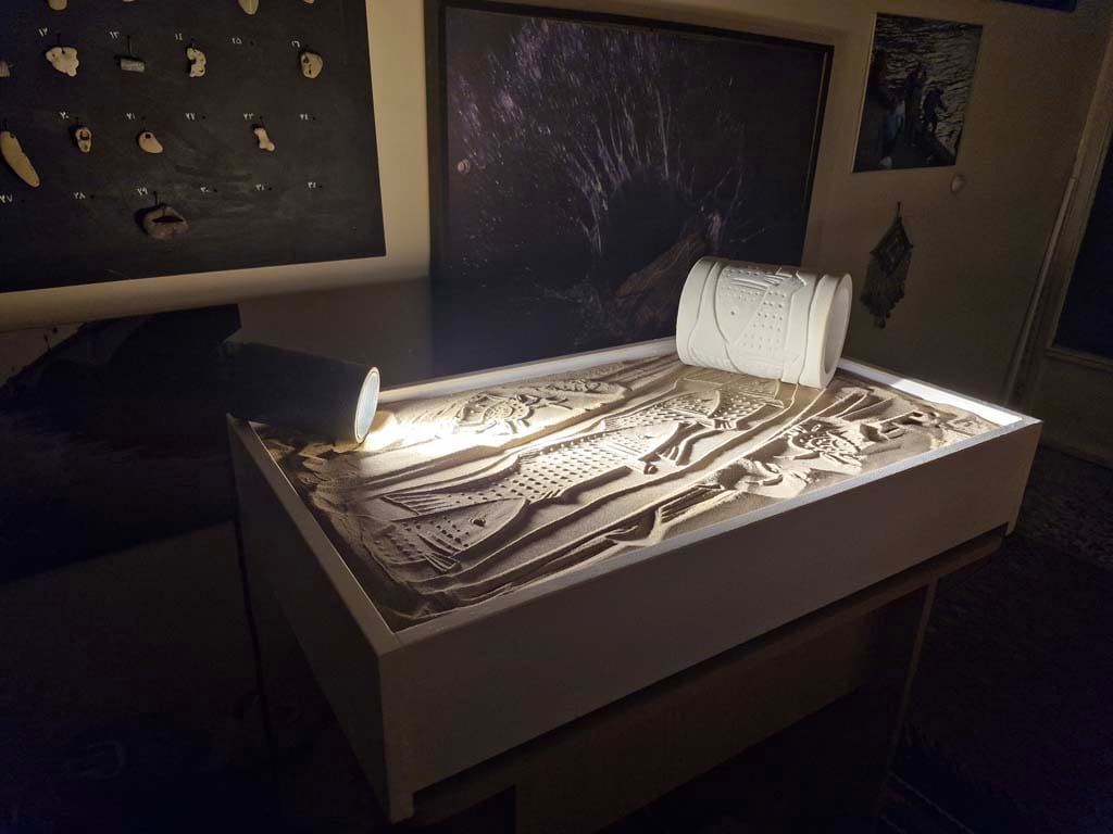 نوع دیگر چیدمان برای مجموعه ها موزه ها تزکیبی از مهر ، نور ماسه بر روی یک جعبه طراحی شده است که دوسانتیمتر لبه دارد. نور به شکا استوانه ای پنهان است و مخاطب می تواند با آن تعامل داشته باشد.