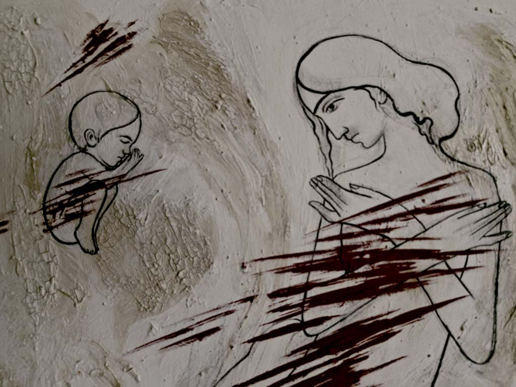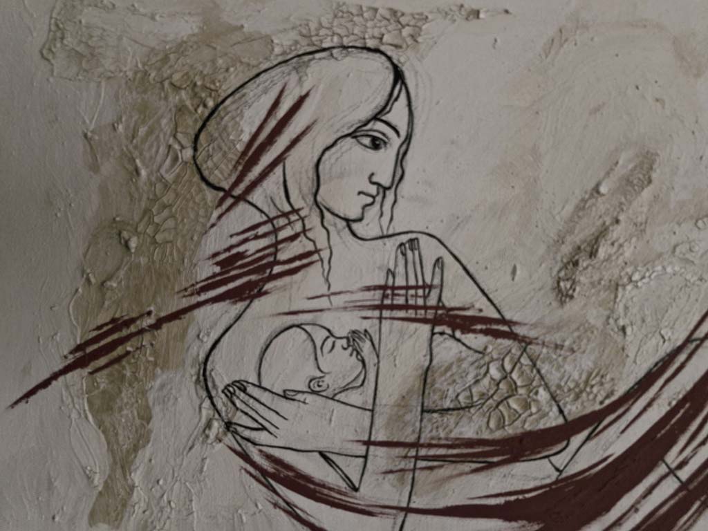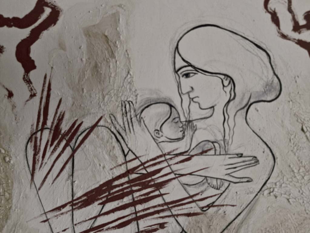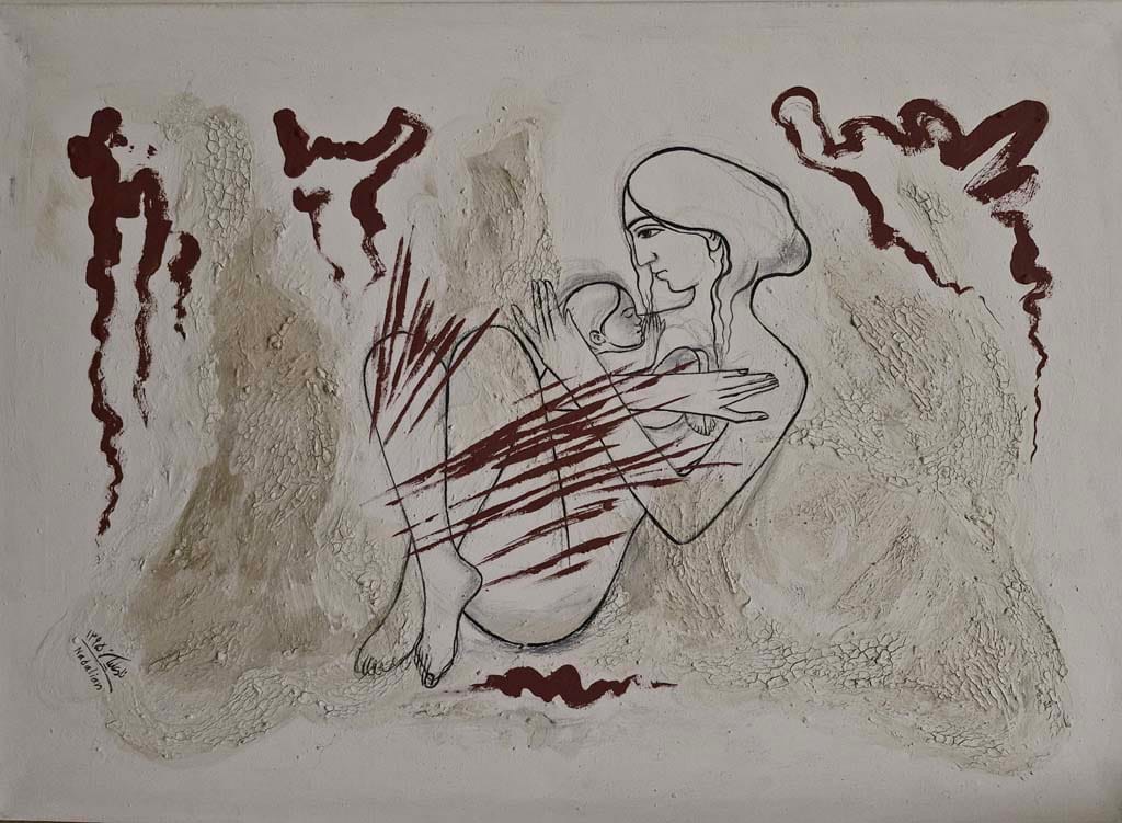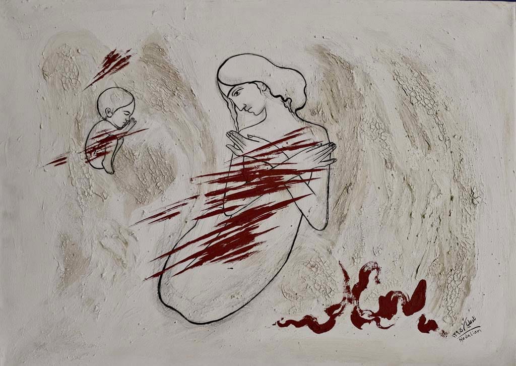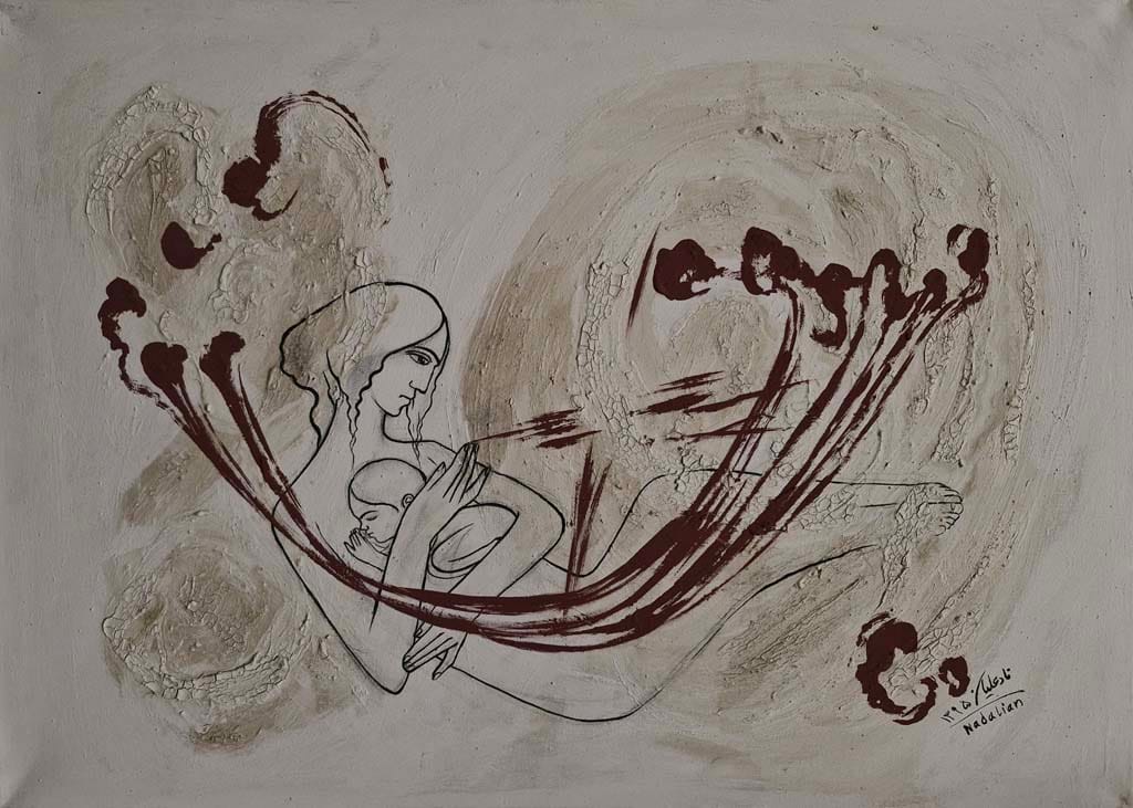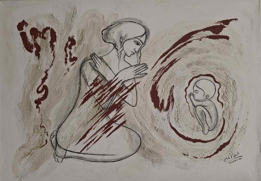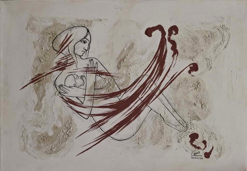نادعلیان این باورها را نه بازتولید بلکه نقد، آشکارسازی و به مادهٔ بصری تبدیل می نماید. خاک سرخ در اینجا استعارهای از همان خون است؛ اما در اثر او، خون دیگر نشانهٔ گناه نیست، بلکه بازگشت قداست به بدن زنانه و زایش است. تصویر مادر-کودک مانند یک ایزدبانوی کهن از دل خاک پدیدار میشود؛ گویی تاریخِ تحمیلشده بر بدن زن را از نو مینویسد.